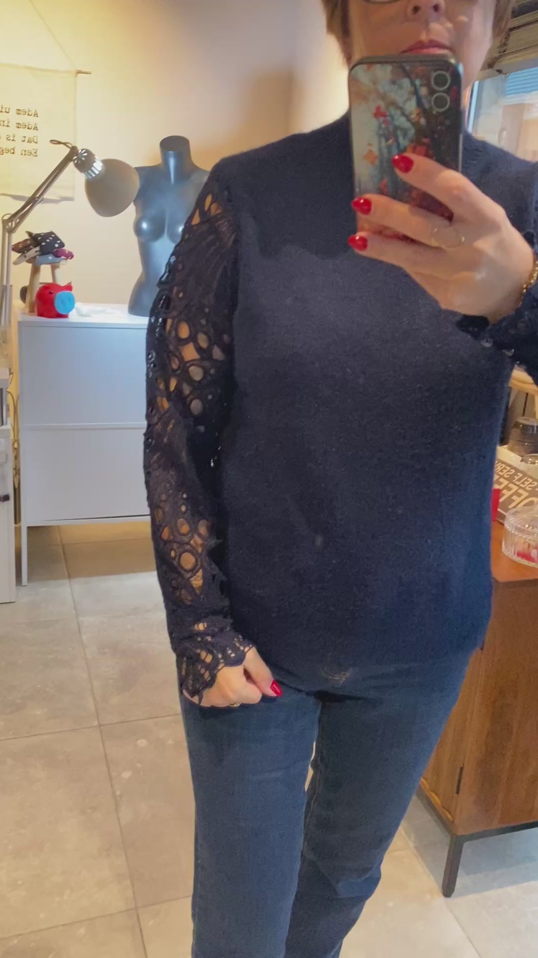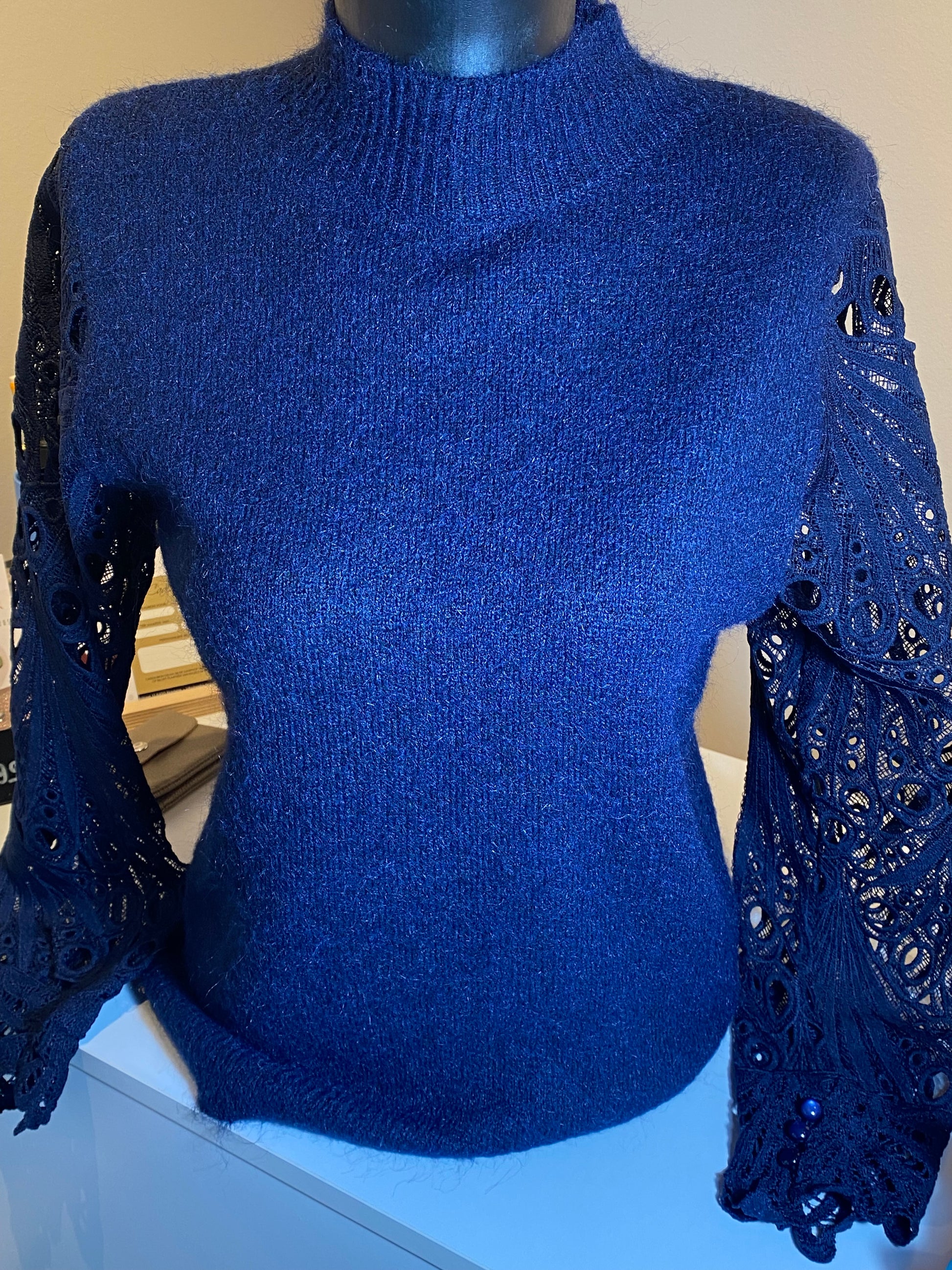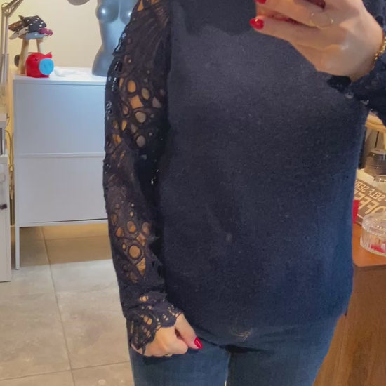 Blauwe trui met kanten mouw