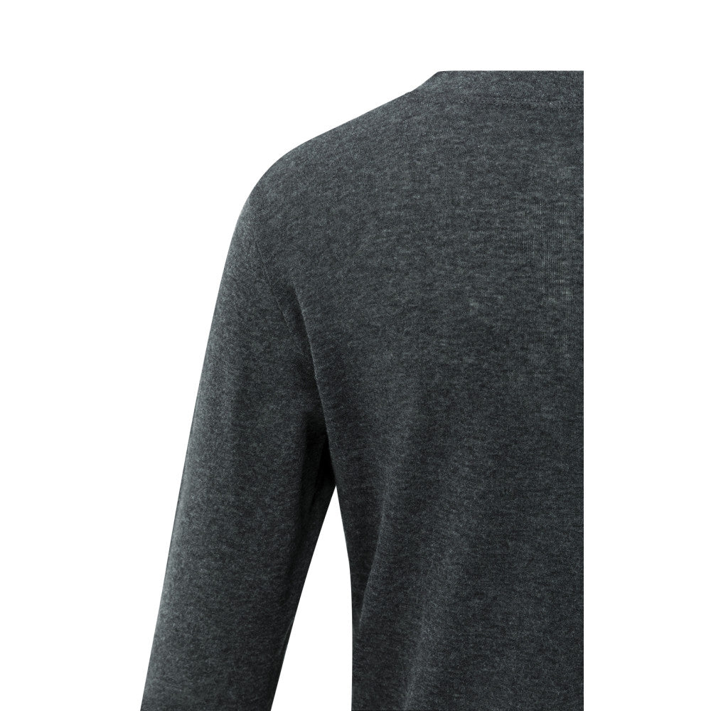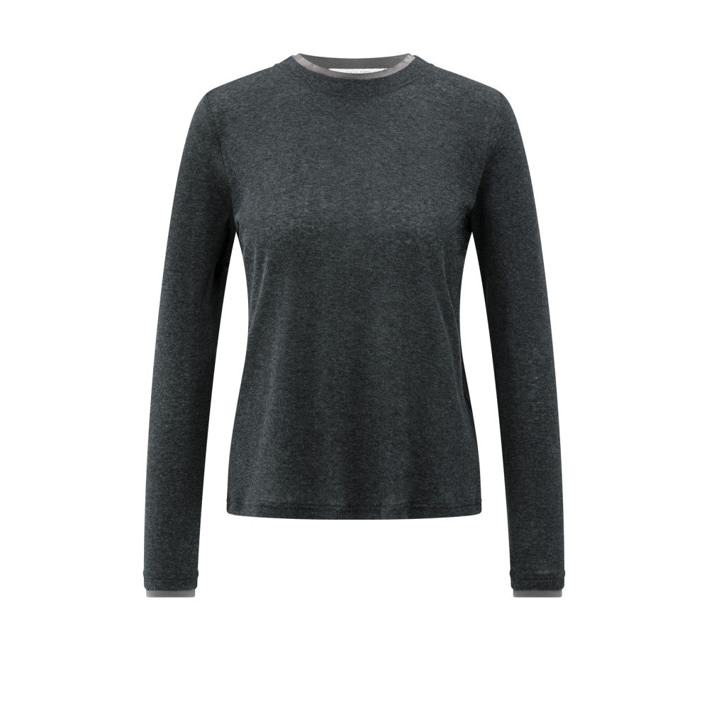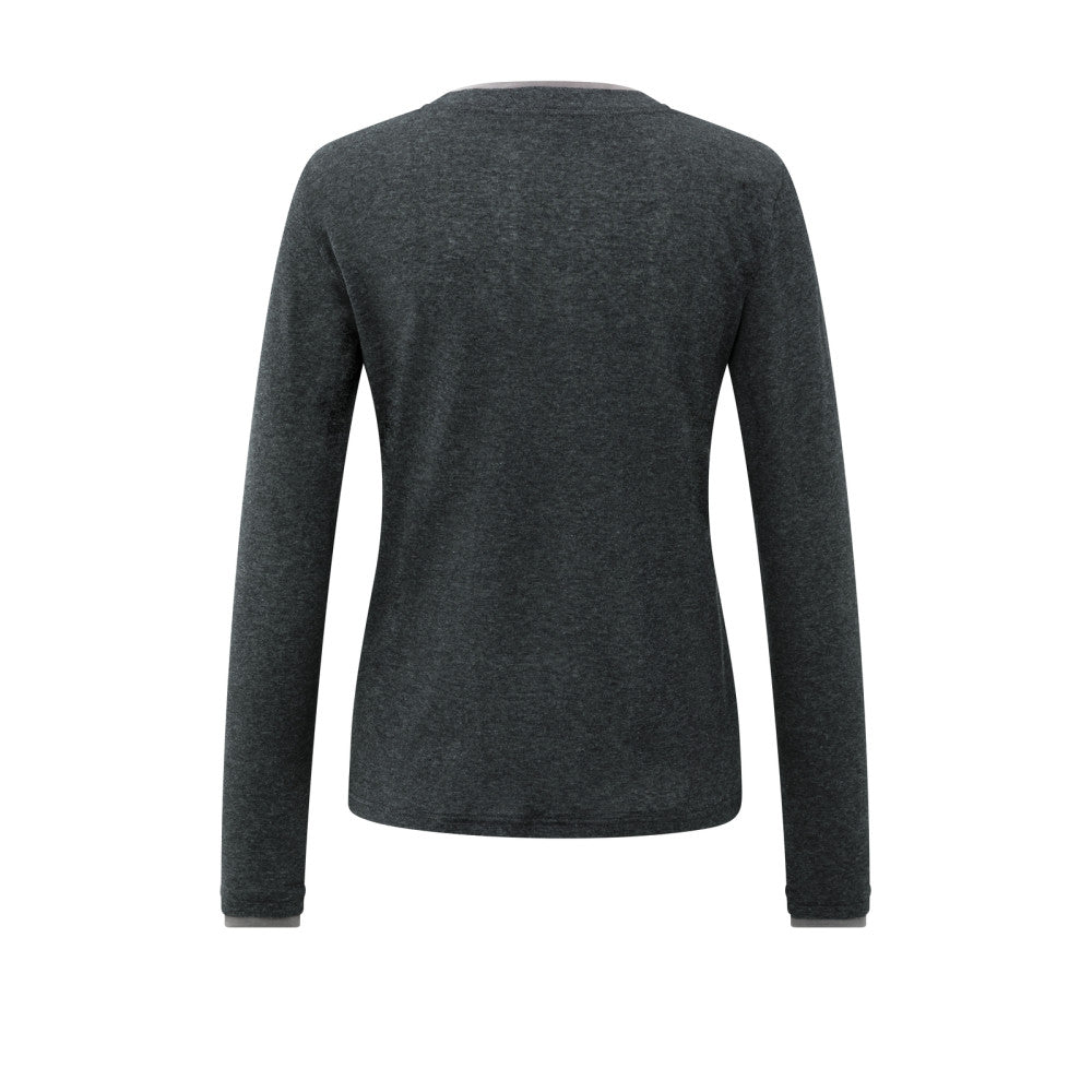 Deze zachte top met lange mouwen heeft een ronde hals en een comfortabele, aangesloten pasvorm. De suedine bies langs de halslijn voegt een subtiel, luxueus accent toe. Gemaakt van een stretchy materiaal met een gemêleerde look, ideaal voor gelaagde outfits of om solo te dragen. Een verfijnde basic met een zachte feel en elegante afwerking.